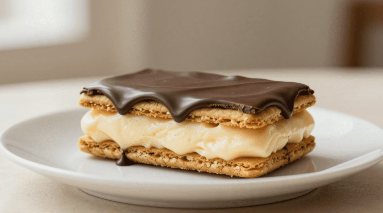 Questo dessert senza cottura rivisita l’éclair tradizionale francese in una versione semplificata ma altrettanto golosa. Con i suoi strati di biscotti Graham imbevuti di crema pasticcera alla vaniglia e la sua glassa al cioccolato, riproduce l’essenza stessa della pasticceria parigina. La magia avviene quando i biscotti si trasformano in una consistenza di torta fondente.