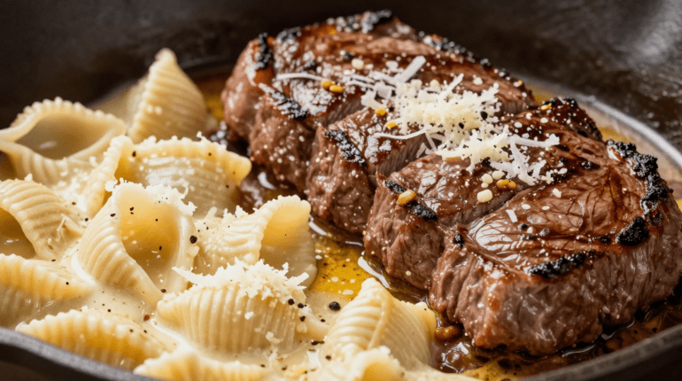 📌 Bistecca al burro all’aglio e pasta cremosa: il piatto confortevole pronto in meno di 30 minuti