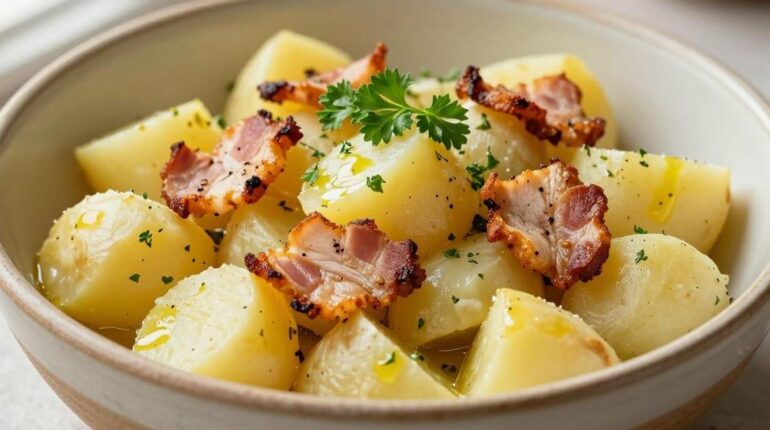 L’insalata di patate si reinventa grazie a un ingrediente sorprendente che trasforma questo piatto familiare in una creazione gourmet. Dadini di tacchino affumicato, rosolati fino a diventare croccanti, apportano una consistenza irresistibile e un contrasto sorprendente con la tenerezza delle patate. Una vinaigrette calda all’aglio completa questa ricetta confortante che rivisita intelligentemente i classici.