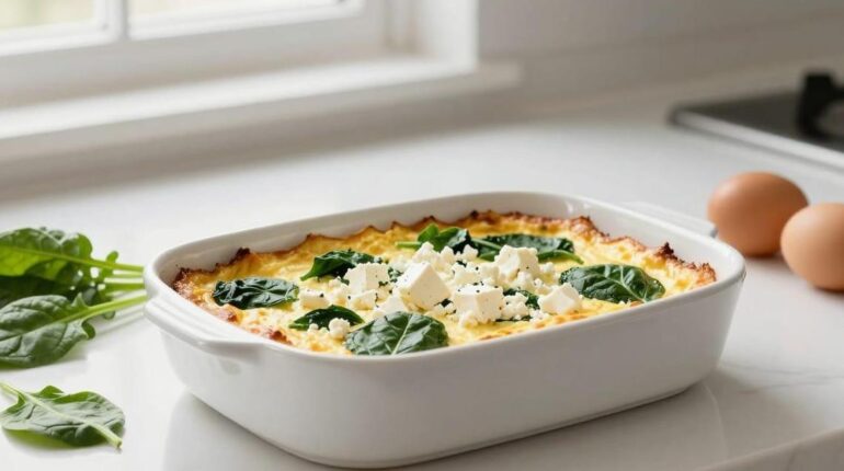Questa tortilla senza crosta trasforma tre semplici ingredienti in un piatto completo ed equilibrato, pronto in meno di 40 minuti. A metà tra un’omelette al forno e una quiche leggera, punta sulla freschezza degli spinaci, la morbidezza della cipolla e il carattere della feta per creare un pasto versatile, saporito sia caldo che freddo.