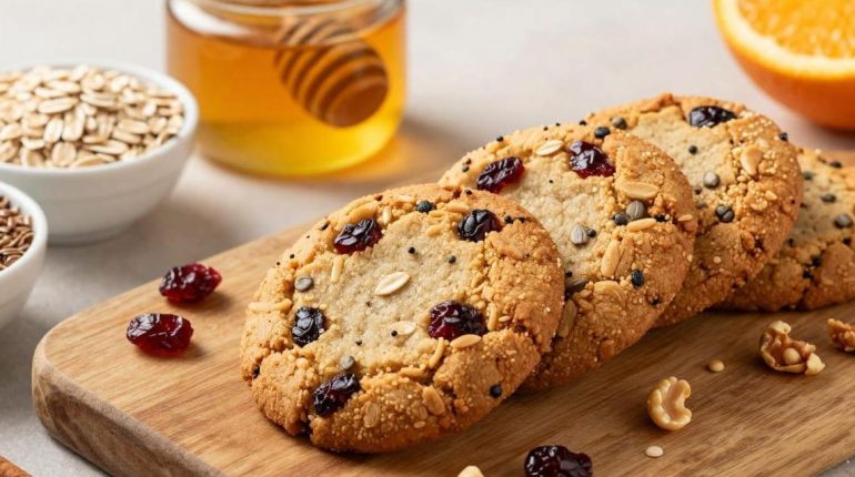 I biscotti senza zucchero né farina rappresentano un’alternativa sana ai dolci tradizionali. Questa ricetta combina fiocchi d’avena, semi e frutta secca, il tutto legato da miele e succo d’arancia. Uno spuntino nutritivo che dimostra che ci si può viziare rispettando i propri obiettivi di salute.