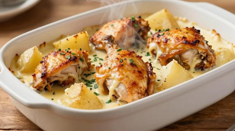 📌 Pollo al forno con patate e salsa al formaggio: la tecnica dell’irrorazione regolare che garantisce una carne ultra-morbida
