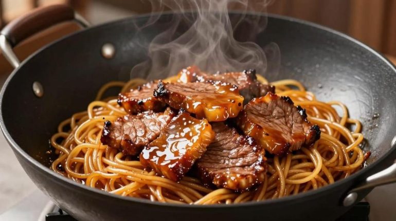 📌 Noodles al manzo caramellato: la tecnica del fuoco vivo che trasforma una cena veloce in un piatto da ristorante