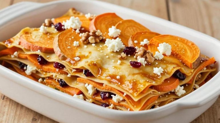 Chi ha detto che le lasagne hanno bisogno della pasta? Questa ricetta rivoluzionaria sovrappone patate dolci, zucca butternut e carote in fette sottili, accompagnate da feta, noci e una sorprendente glassa al miele e mirtilli rossi. Un piatto vegetariano che trasforma radicalmente il concetto stesso di questo grande classico italiano.