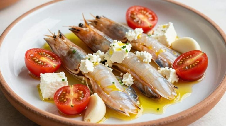 Scampi, pomodorini, feta, aglio e olio d’oliva: bastano cinque ingredienti per comporre questo piatto mediterraneo al forno che sposa tenerezza marina, dolcezza acidula e cremosità salata. In meno di 30 minuti, questa ricetta trasforma prodotti semplici in una cena raffinata, dove i sapori si concentrano naturalmente durante la cottura. L’equilibrio perfetto tra rapidità d’esecuzione ed eleganza gustativa.