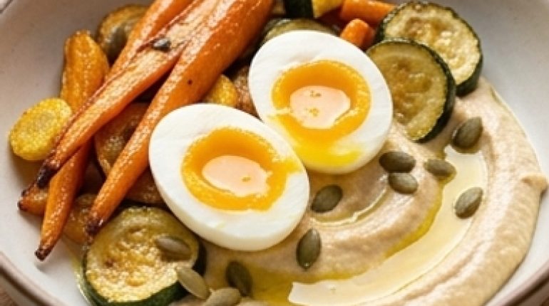 📌 Bowl di hummus, uova barzotte e verdure arrostite