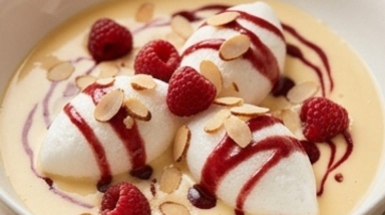 È il tipo di dessert che si tira fuori la domenica sera quando si vuole far colpo senza passare due ore in cucina. L’isola flottante la conoscono tutti. Ma con un caramello all’aceto di lamponi invece del caramello classico, diventa davvero un’altra cosa.