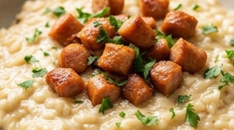 📌 Risotto cremoso alla Cancoillotte e crispy di salsiccia affumicata