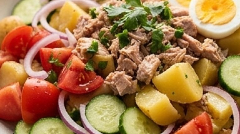 È un pranzo domenicale senza grandi ambizioni. Hai delle uova, una scatoletta di tonno e qualche patata che aspetta dall’inizio della settimana. In un’ora, senza sforzo, porti in tavola un piatto che sazi davvero. Questa insalata è il comfort food per chi non ha voglia di far finta.