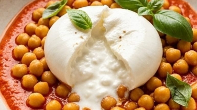 Ceci arrostiti, salsa Romesco fatta in casa e burrata cremosa